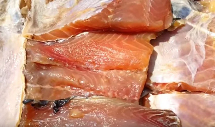 Соль будет забирать влагу у рыбы, а образовывающийся рассол уйдет через отверстия, поэтому способ и называется сухим. Выдерживайте тушки от 3-5 дней. После этого вынимайте, мойте и отмачивайте 2-3 часа в холодной воде. Теперь можно вывешивать в темном месте на сквозняке.