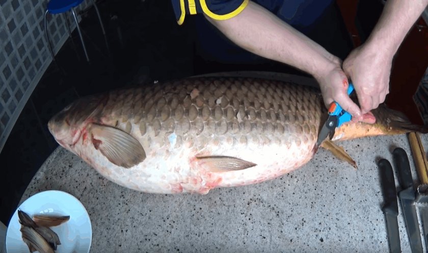 - очистите рыбу от шелухи. После этого отрежьте голову, хвост и плавники. Затем еще раз ополосните тушку. Теперь сделайте надрез вдоль спинного плавника и удалите его. Брюшко оставьте целым. Со стороны спины выньте позвоночник и выпотрошите сазана. Удалите кости. Снова помойте рыбу и хорошо обсушите.