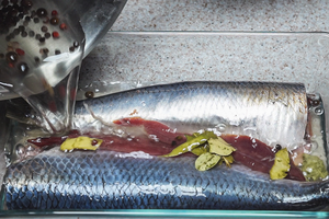 - Сельдь необходимо залить остывшим маринадом, и подержать при комнатной температуре 180 мин. Затем кастрюлю следует отправить на среднюю полку холодильника.