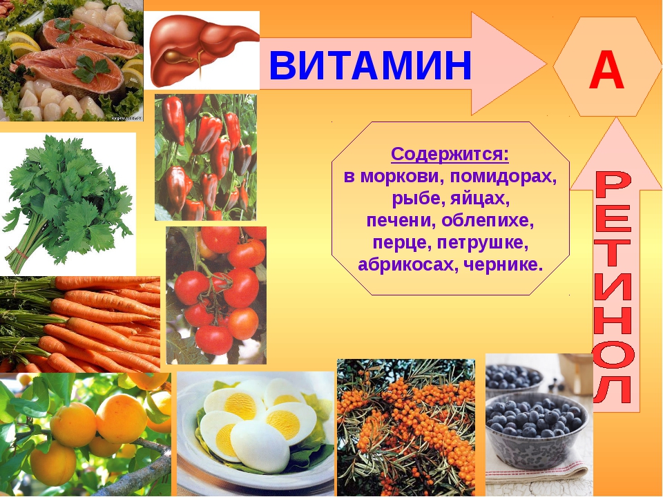 Витамин А содержится в жире печени рыб. Он также находится в желтой части яиц. Сладкий картофель, морковь и другие фрукты и овощи темного цвета содержат вещества, которые организм может преобразовывать в витамин А.