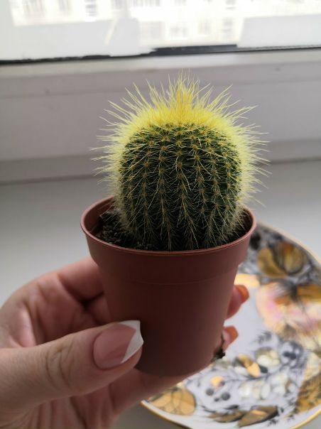Маммиллярия – похожа на ежовый кактус, но не имеет рёбер, по цвету – блекло-зелёная, колючки – мягкие, по виду напоминает пушистый шарик. Обычно небольшой кактус, при должном уходе цветёт.