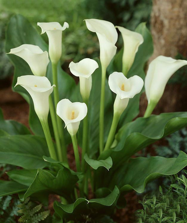 Элегантные каллы с высокими стеблями любят за шикарные и красочные цветы в форме трубы, а также за красивую прямостоящую листву.