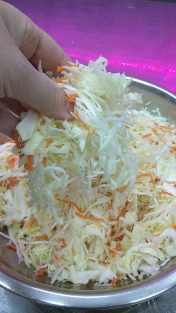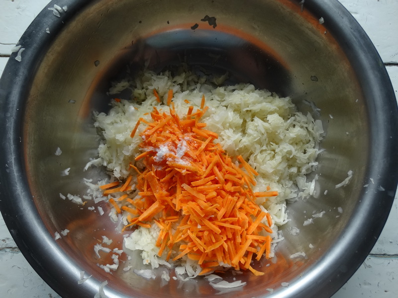 - Добавьте соль и втирайте ее в капустную смесь в течение нескольких минут, пока рассол не начнет скапливаться на дне миски.