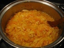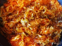 - Всыпать квашеную капусту и тушить минут 10, затем выложить свежую капусту. Если размеры казанчика позволяют, то можно высыпать сразу всю свежую капусту, если казанчик маловат, то выкладываем свежую капусту в несколько приемов, выжидая, когда предыдущая закладка размякнет и уплотнится.