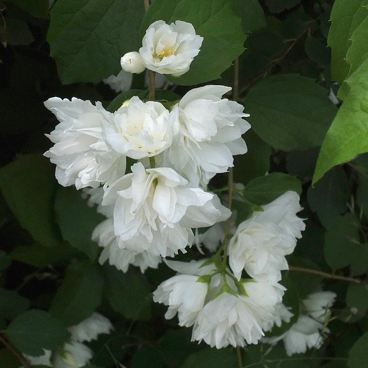 Высота и ширина куста: 90-120 см, компактная крона. Цветет с конца июня до начала – середины июля. Белые махровые цветки 3-4 см в диаметре с нежным ароматом, собранные в соцветия по 4-7 штук.