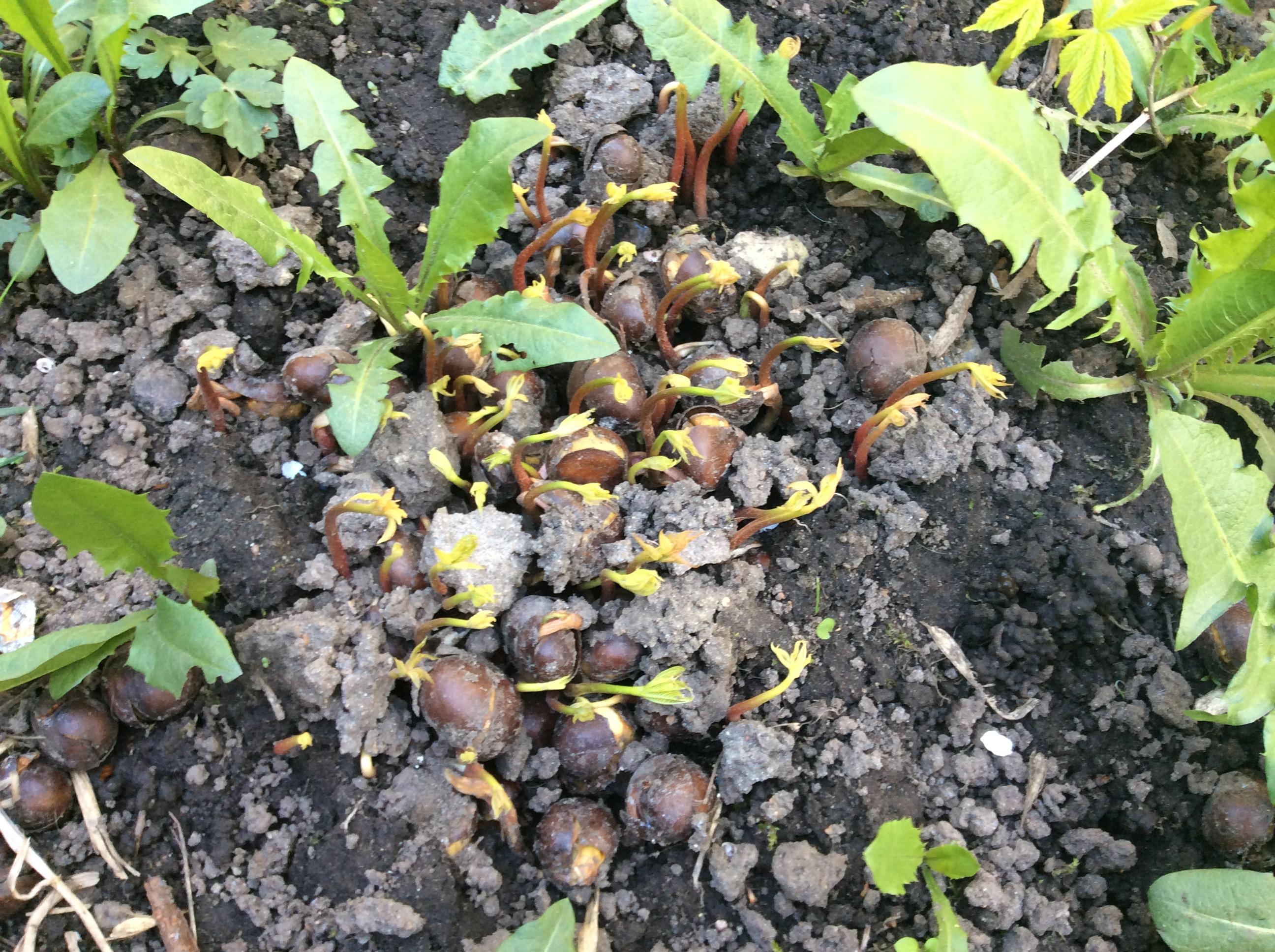 По истечении срока, вынимаем из холодильника наши каштанчики и перекладываем их в другой контейнер, присыпаем землёй вперемешку с песком и ждём первых всходов. Произойдёт это примерно, через 1-1.5 месяца. После появления первых ростков, каштан буде расти очень быстро. К концу мая можно пересаживать в открытый грунт.