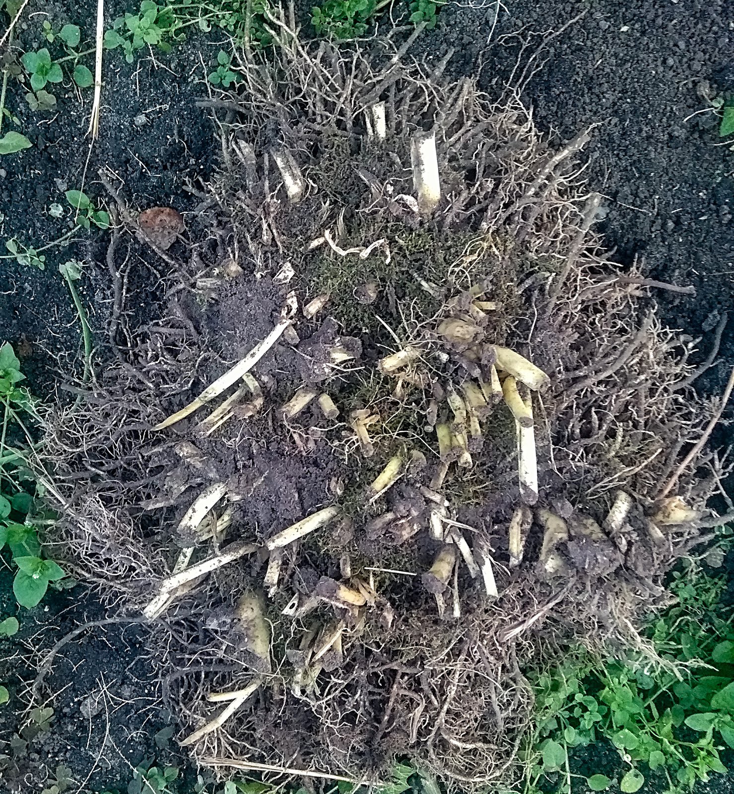 Довольно крепкие корни потребуют приложить силу, чтобы разделить их. Окопайте немного по периметру вокруг куста, затем, используя садовую вилку как рычаг, приподнимите и вытащите корни. Если растение крупное и комок с корнями большой, то удобно это делать вдвоем – каждый со своей стороны.