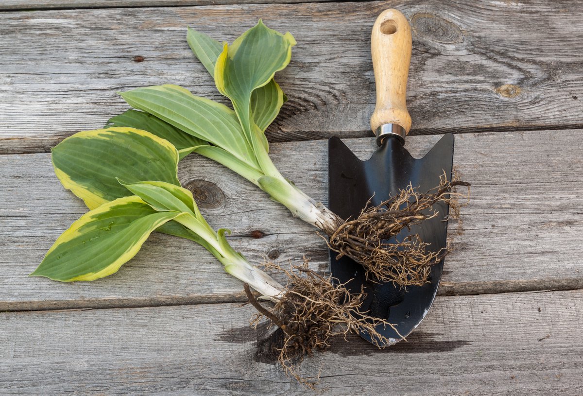 С помощью лопаты аккуратно выкопайте хосту с большим комом земли, так как у нее объемная корневая система.