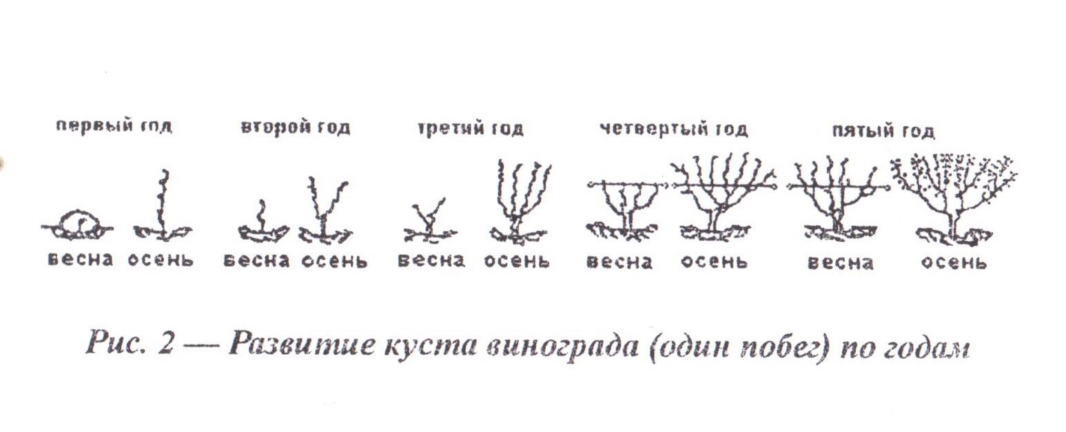 В первый год осенью в лозы без веток срезают верхушку так, чтобы осталось 3-4 почки. В следующем году из нее вырастут два боковых побега – их нужно будет осенью вместе с верхушкой укоротить до 2 почек. На третий год на лозе будет 6 веток – снова укоротите их так, чтобы осталось 3–4 почки на свежих приростах, при этом более старые части побегов будут с одревесневшей корой. На четвертый год снова укоротите только зеленые приросты, оставляя 4 почки. Смысл этой обрезки в том, что таким образом формируются рукава – крепкие боковые лозы (похожие на скелетные ветви деревьев).