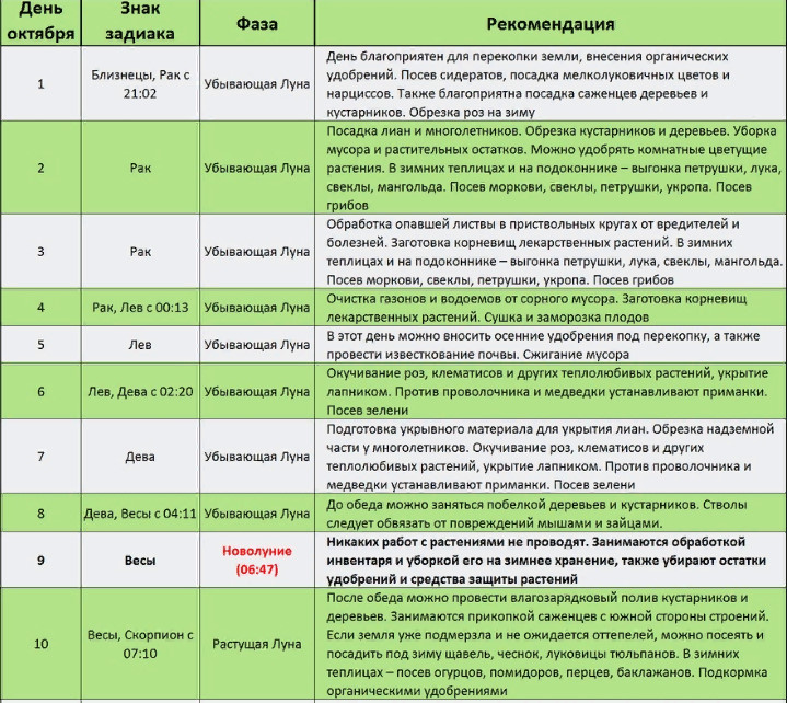 1 октября (15 -й лунный день), 3 октября (17 -й лунный день), 9 октября (23 -й лунный день), 10 октября (24 -й лунный день), 23 октября (8 -й лунный день), 24 октября (9 -й лунный день), 25 октября (10 -й лунный день), 27 октября (12 -й лунный день), 28 октября (13 -й лунный день), 29 октября (14 -й лунный день), 30 октября (15 -й лунный день)