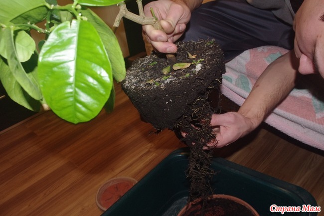 Высокие старые деревья затруднительно перемещать из одной кадки в другую, для этого требуются специальные приспособления — рычаги, блоки, лебёдки, поэтому лучше ограничиться частичной заменой почвы: