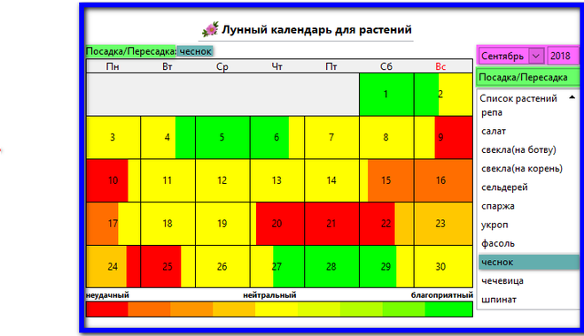 Чеснок,Лук нарепку | 5-11 15-22 | 1-7, 12-15 18-20, 24, 25 | 4-6, 10-15 27 и 28 | 1, 2, 10-14, 18 19, 28 и 29 | 5, 6, 11, 12 15-17, 20 25 и 26 | 2-4, 6-8, 12 13, 17, 18 22, 23 и 30 |