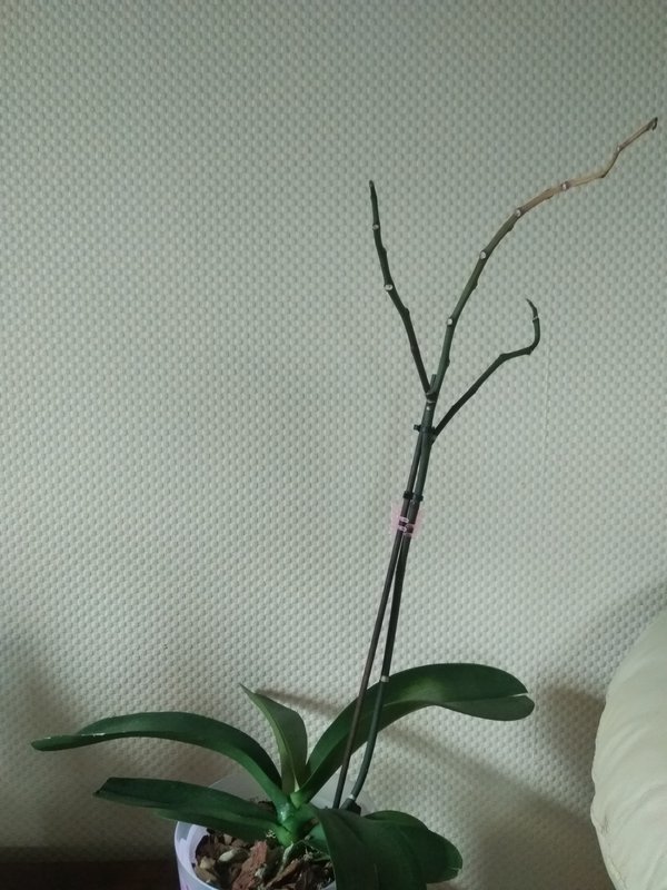 Осмотрите внимательно цветонос, на нем есть спящие почки, из которых с большей долей вероятности могут появиться новые цветы или детки. Для того чтобы добиться повторного цветения или появления деток, следует обрезать цветонос примерно на 1,5-2 см выше этих почек. Но несмотря на все ваши старания, нет никакой гарантии, что спящие почки тронутся в рост. Здесь же стоит заметить, что в некоторых случаях обрезка старого цветоноса над спящими почками будет замедлять развитие новых цветоносов, так как растению нужно будет тратить все силы на поддержку старого цветоноса, а на развитие нового ничего не останется.