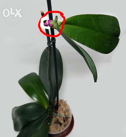 Цветонос орхидеи фаленопсис появляется из-под листа. В первое время, как только на укороченном стебле орхидеи появляется нечто — небольшой зеленоватый конус, невозможно определить что это будет — цветонос или корень. И только по прошествии времени, когда длина его достигнет хотя бы 1 см, становится ясно.