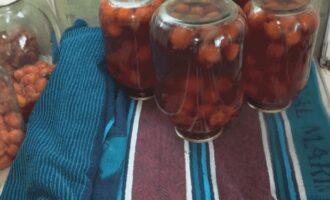 Далее баночку переворачиваем вверх ногами, ставим на крышку. Смотрим герметичность закатки, не течет ли чего. Перевернутую банку укутываем в толстое полотенце и пусть в таком положении стоит и остывает прямо в комнате.