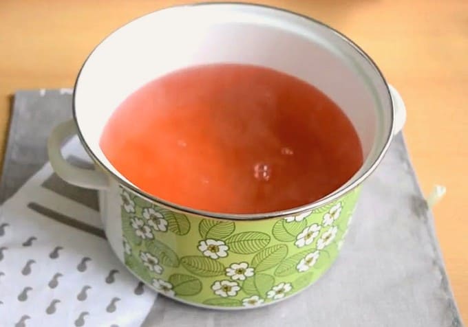 После чего получившийся сливовый настой нужно слить в кастрюлю. Он будет вот такого красноватого цвета или темнее/светлее, в зависимости от цвета ваших слив. Сами фрукты при этом оставляем в банке. Удобно сливать воду с помощью капроновой крышки с отверстиями (она продается в любом хозяйственном или посудном магазине).
