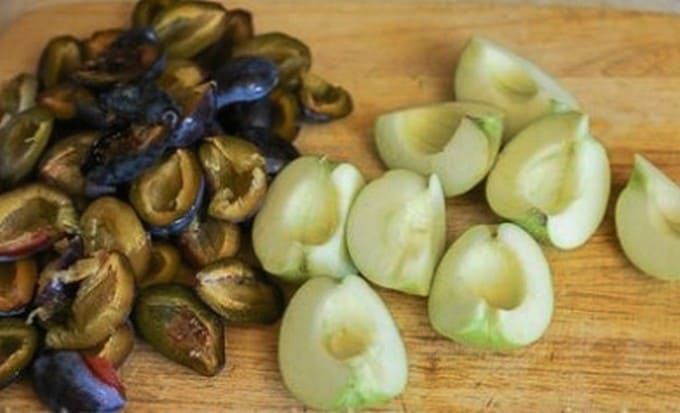 Предварительно сливы нужно проколоть в нескольких местах зубочисткой, чтобы не лопнули от кипятка. А яблоки мы нарезаем произвольными ломтиками, удаляя серединку с перегородками и косточками.