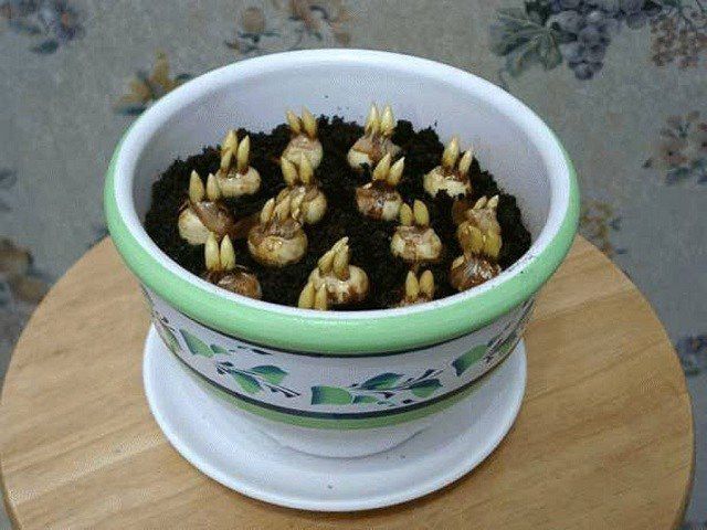 - Выращивание культуры осуществляют в неглубоких и широких горшках, причем, если в одну емкость высаживают несколько луковиц, то они не должны друг с другом соприкасаться.