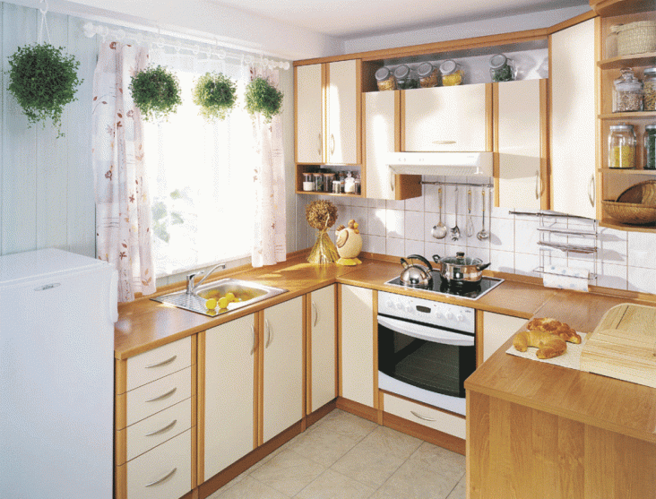 Площадь малогабаритных квартир обычно составляет 18 — 30 кв. м, при этом под кухню отводится 6 — 10 кв. м. Как же сделать маленькую кухню удобной? Во-первых, стоит правильно подобрать планировку. Для квадратной кухни будет кстати П-образное расположение гарнитура (вдоль трех стен).