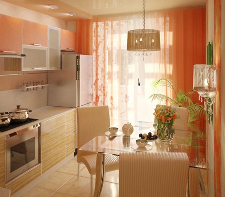 - Маленькую кухню не рекомендуется украшать пышными портьерами и подбирать темные тона штор, т.к это произведет эффект уменьшения пространства. Лучше выбрать легкие ткани, такие как тюль, органза или шелк.
