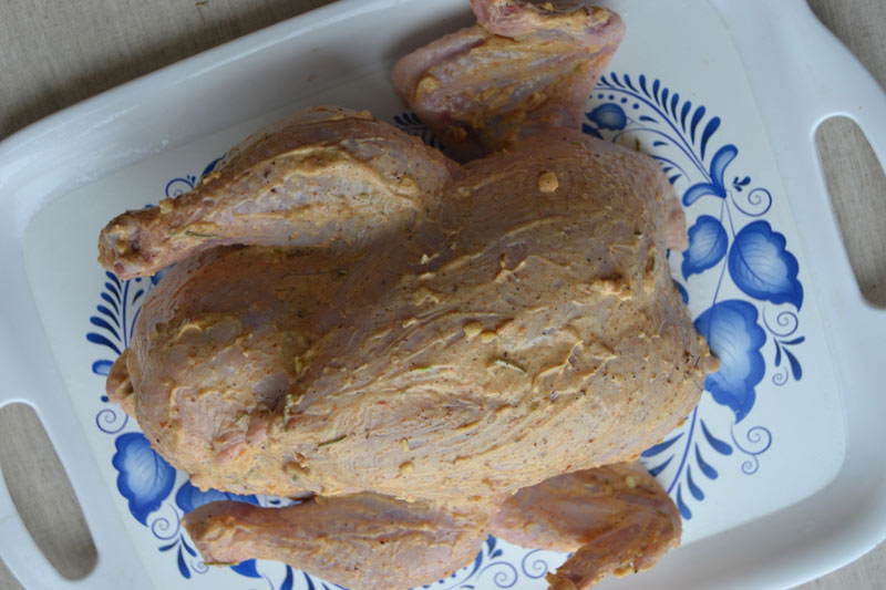 Берём куру, тщательно моем и натираем её нашим маринадом снаружи и внутри: