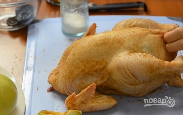 Чеснок очищаем и давим давилкой. Смешиваем его с перцем, солью и травами. Травы и пряности можете выбрать на ваш вкус или воспользоваться готовыми смесями из магазина. Примерный состав специй: тимьян, розмарин, базилик, красный перец, гвоздика, майоран. Курицу используйте охлажденную, тщательно ее вымойте в холодной проточной воде. Срезаем с нее весь видимый жир. Натираем ее внутри и снаружи пряной смесью, а затем обильно обмазываем майонезом или сметаной.2 Фаршируем курицу яблоками.