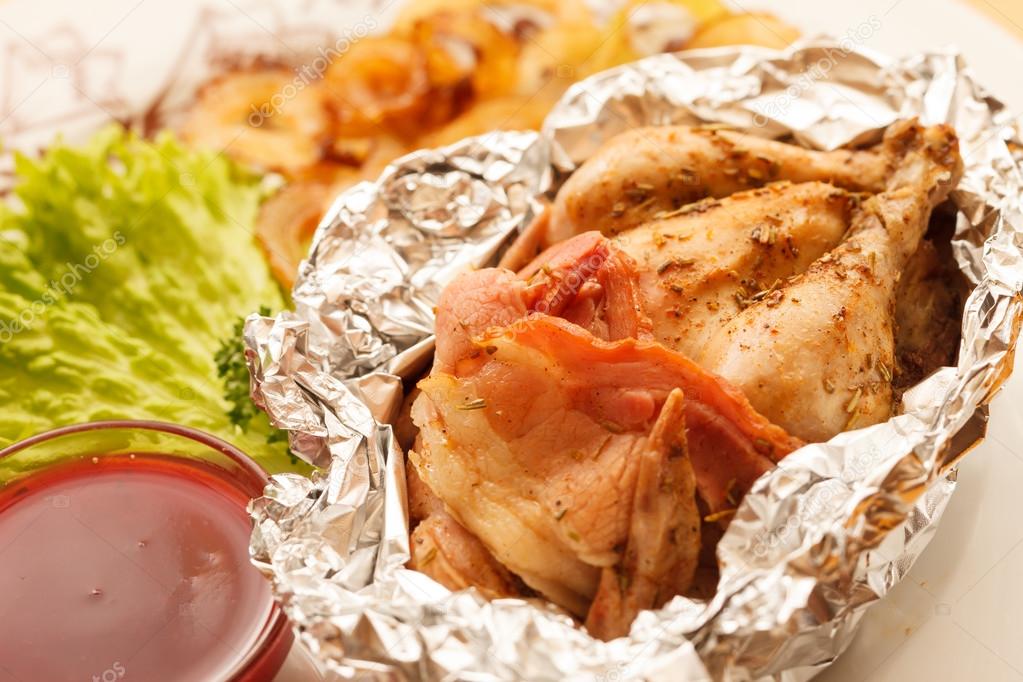 Курицу приготовленную в фольге можно подавать с любыми овощами и гарниром, а можно и без него. Приятного аппетита!