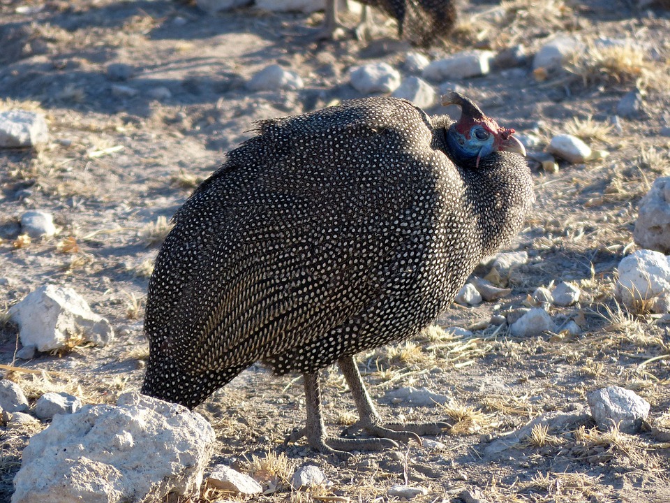 В английском языке название птицы всегда было более запутанным, поскольку термины «цесарка» и «цесарка» используются взаимозаменяемо и относятся либо к самкам, либо к самцам птиц этого вида. Цыплята похожи по размеру на цыплят и фазанов, но их легко узнать по отчетливому белому точечному рисунку на жемчужно-сером оперении, а также по лысой, похожей на стервятника голове.