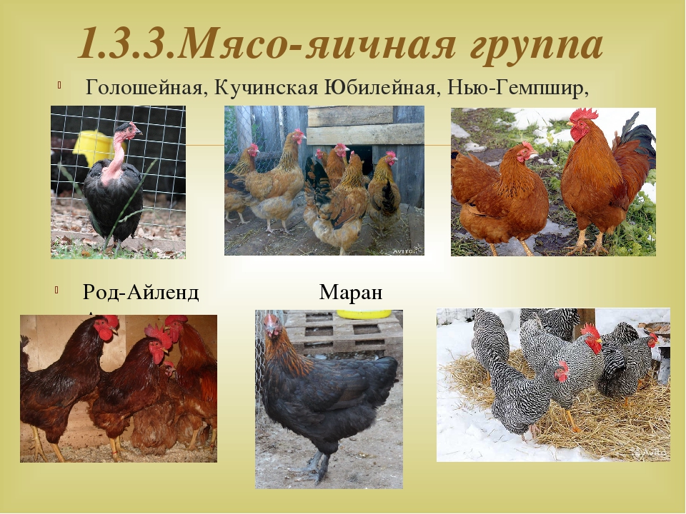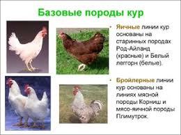 - Яйцо: имеют малую живую массу, мясо невысоких вкусовых качеств, но высокую яйценоскость (русская белая, леггорн , Орел, фигун).