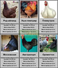 - Мясоедные универсальные куры с хорошей яйценоскостью и хорошим вкусным мясом (род-айланд, Полтавская, Нью-Гэмпширская, Московская черная порода цыплят (фото в тексте)).