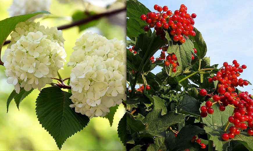 Неприхотливый кустарник с полезными ягодами. Сортов существует десятки, каждый из них имеет свой оттенок цветок. Ягоды Калины стоят до заморозков, служат декоративным элементом. Их собирают, сушат, замораживают, перетирают с сахаром.