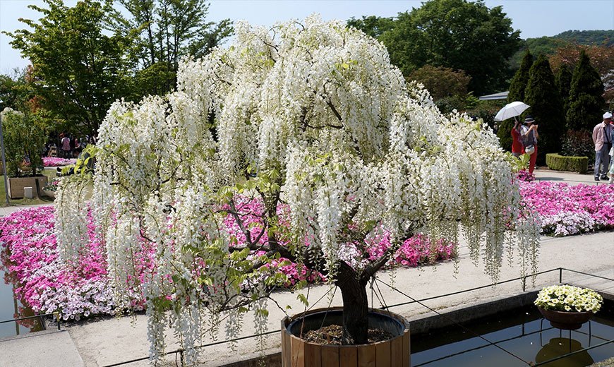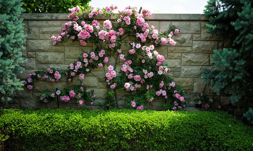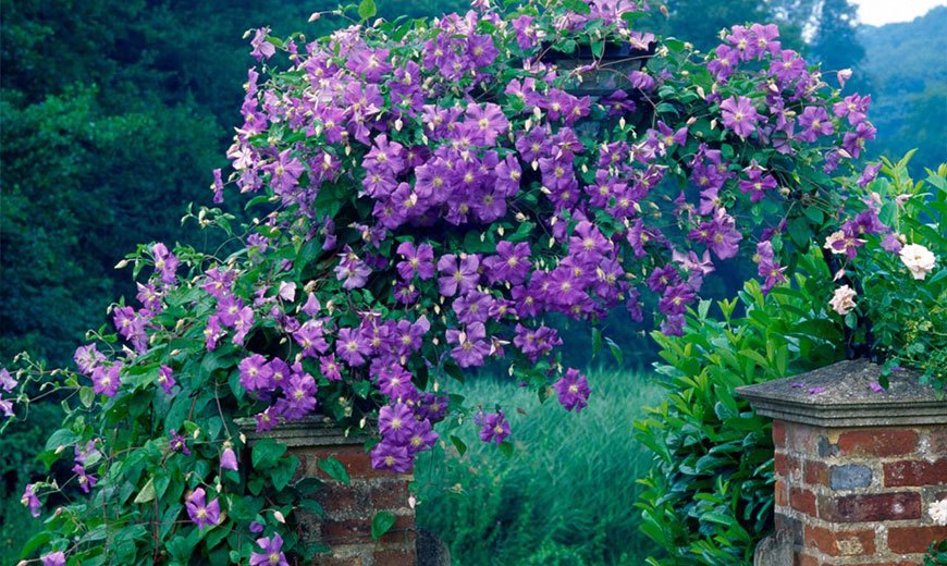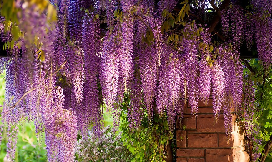 Максимальная высота Глицинии – 18 метров. Цветы напоминают гроздья винограда и напоминают о себе до самой осени. Глициния используется для декорирования зданий, арок, зоны отдыха. Побеги легко плетутся по натянутым нитям. Кустарник спокойно переживает зиму, особого ухода не требует.