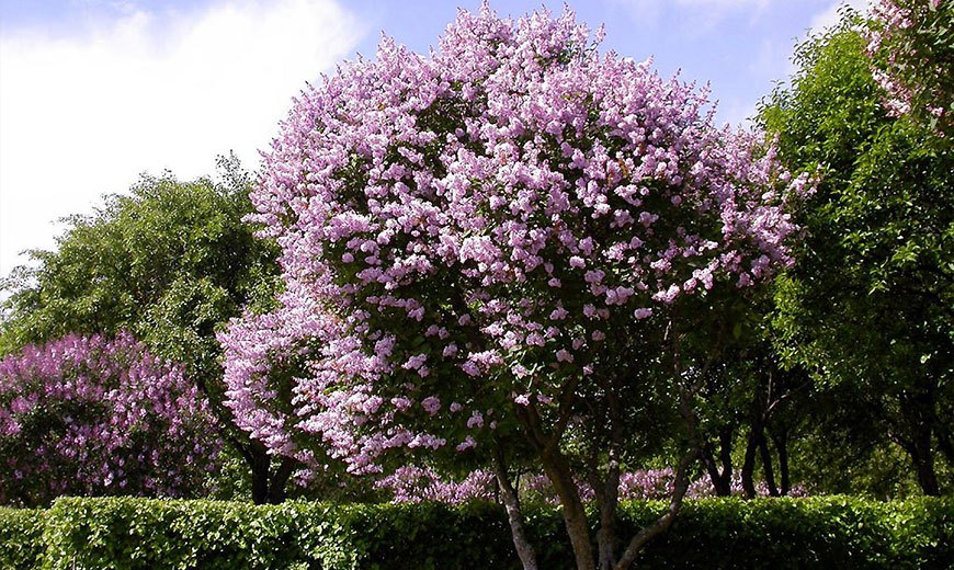 Высота кустарника 3 метра. Начинает цвести в июле, последние цветы можно увидеть в октябре. Соцветья напоминают гроздья сиреневого цвета. Куст можно обрезать, формируя из него нужную форму.