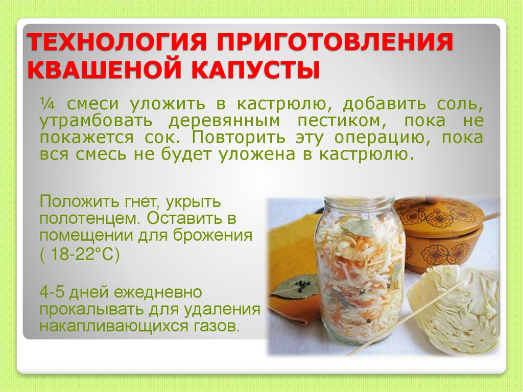 Квашение является естественным процессом брожения. Вырабатываемая при нем кислота служит консервантом, подавляющим рост и развитие болезнетворных бактерий, в том числе кишечной палочки. Пожалуй, это лучший способ заготовки овощей: используется меньше соли, чем при солении, и не добавляется уксус, как при мариновании.