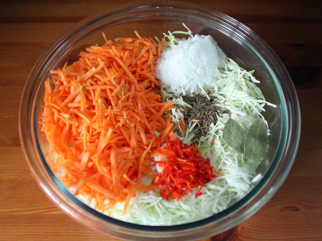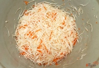 3. Добавьте нашинкованную морковь, при желании – приправы. Посолить, на 1 кг капусты – 30 г моркови и 20 г соли.