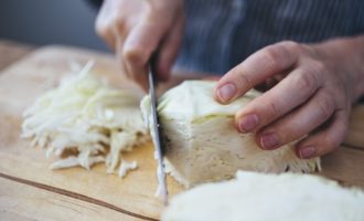 - Белокочанную капусту нарезаем недлинной, тонкой соломкой.