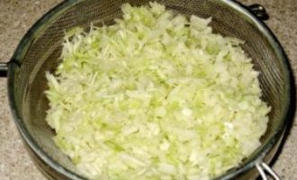 1. Выкладываем нарезанную кусочками капусту в кипяток и настаиваем 5-7 минут. После этого откинуть на дуршлаг и немного отжать. Измельчаем лук и чеснок.