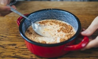 6. Доливаем в кастрюлю около стакана воды, так чтобы она немного покрыла крупу. Закрываем крышку и оставляем тушиться на малом огне ещё 15 минут.
