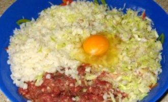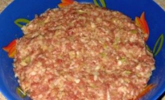 - С помощью мясорубки измельчаем капусту и половину луковицы. Кладем их в мясо, вбиваем яйца, солим, перчим и добавляем специй для мяса.