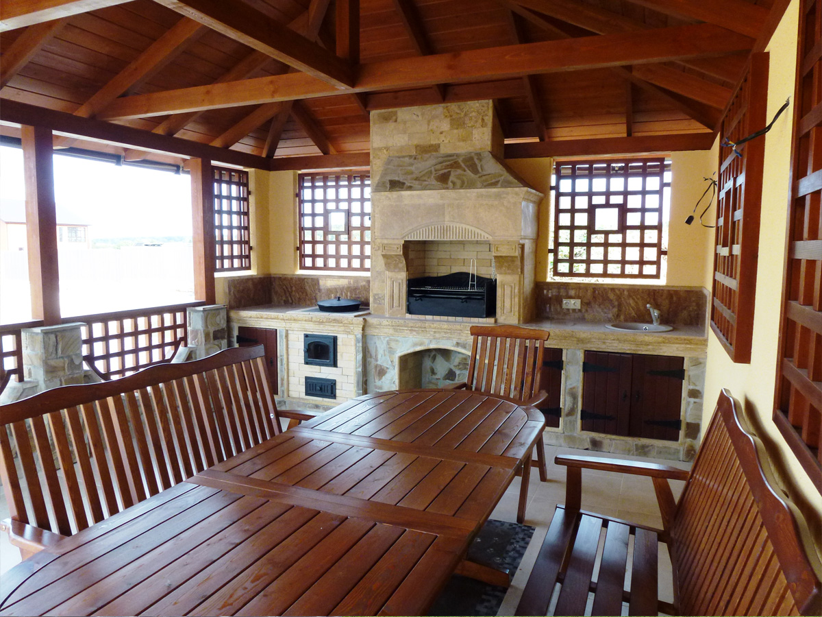 Гораздо проще сделать сборный крытый вариант кухни из бруса. Такой проект будет менее затратным, но каждая деталь здания потребует постоянного ухода и обработки. К тому же дерево намного быстрее изнашивается, чем кирпич или камень.