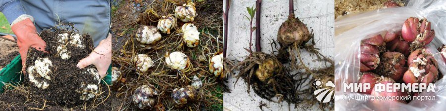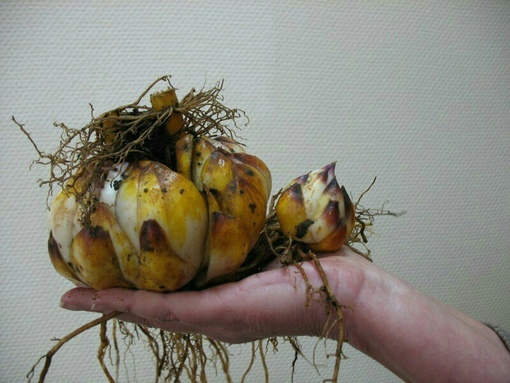 Выкопанное с комом земли гнездо луковиц делят, стараясь не повредить корни. Зеленью, без признак» заболеваний стебли коротко обрезают, отмершие аккуратно выкручивают. Удаляют сухие, поломанные и с подозрительными пятнами чешуйки, сухие корни. Длинные живые корешки можно слегка укоротить.