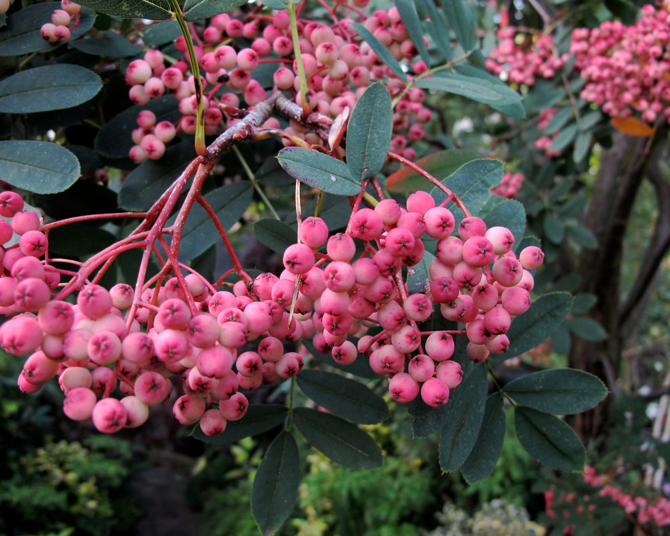 рябине Кене. Родом она из Китая и о родственных связях с рябиной обыкновенной напоминают лишь декоративные листочки, схожие по строению. Летом они изумрудного окраса, а к осени приобретают багровые оттенки. Отдельного внимания заслуживают ягоды — белые, наливные, как фарфоровые. Часто их называют жемчужным ожерельем. На вкус они горькие, но очень любимы птицами. Деревце вырастает всего до 5 метров в высоту и выгодно выделяется на фоне других сортов, так как может стать шикарным украшением даже маленького сада.