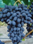 - Академик. Гибрид со сверхранними сроками созревания. Кисти весят 0,8-1 кг. Ягоды иссиня-черные, хрустящие, длинные — достигают 3,3 см. Вкус десертный — 9,8 баллов. Кусты мощные, способны выдержать большой перегруз. Привлекает ос.