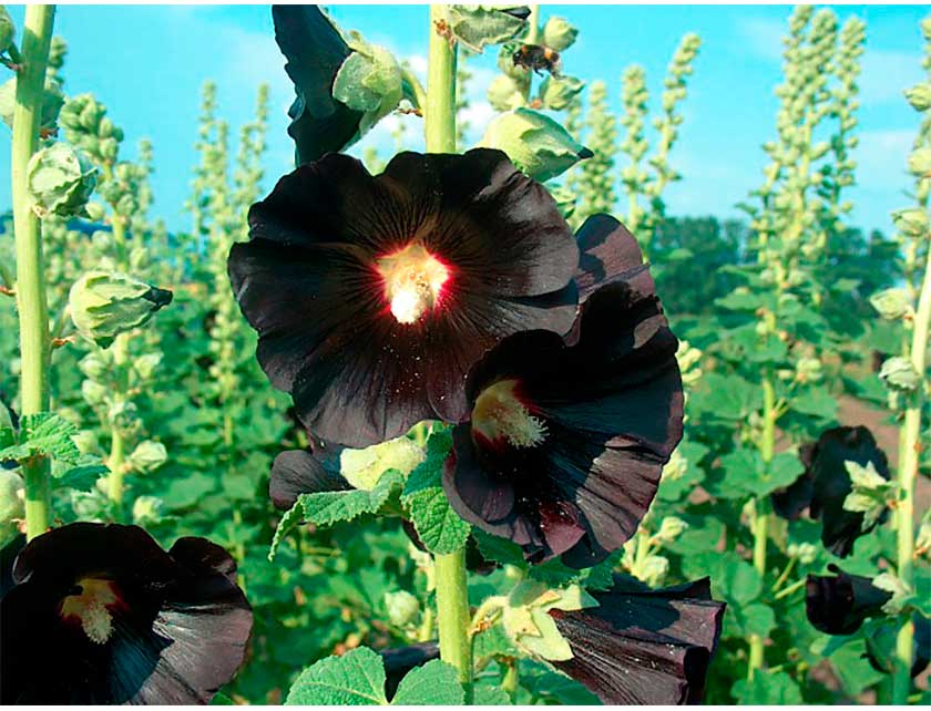Эта мальва многолетняя, но чаще выращивается как двулетник. Высота куста – от 1,5-2 метров в высоту. Культура отличаются неординарностью – может иметь на одном цветоносе одновременно одноцветковые, двухцветковые, полумахровые и махровые соцветия диаметром до 12 см. Расцветка тоже неоднозначная – по краям имеет белый цвет, а к середине бутона варьируется от красного до темно-бурого. Хорошо растет в полутени и на солнце.