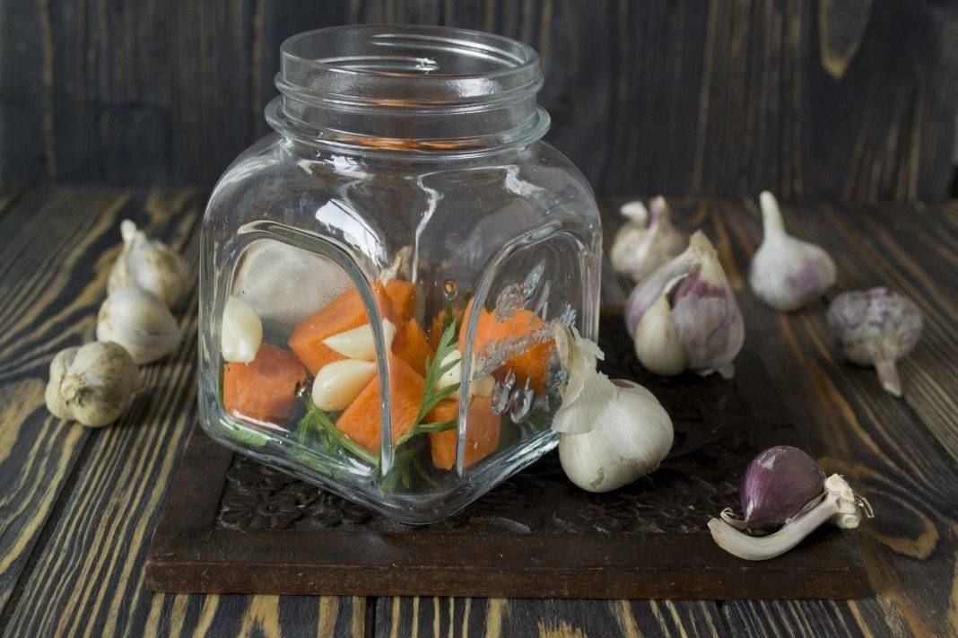 - На дно банок уложить зубчики чеснока, душистый горошек, зонтики укропа, лавровый листик.
