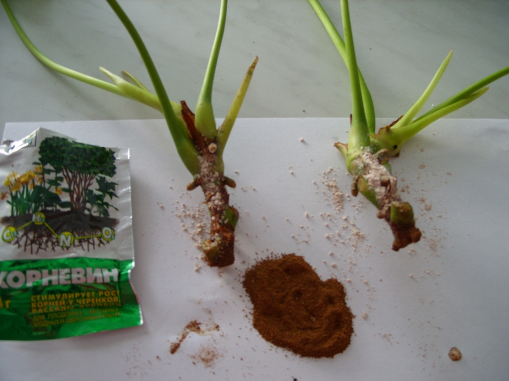 - перед тем как укоренить побеги, их оставляют на 50–60 минут на открытом воздухе для лёгкого подсушивания корешков;