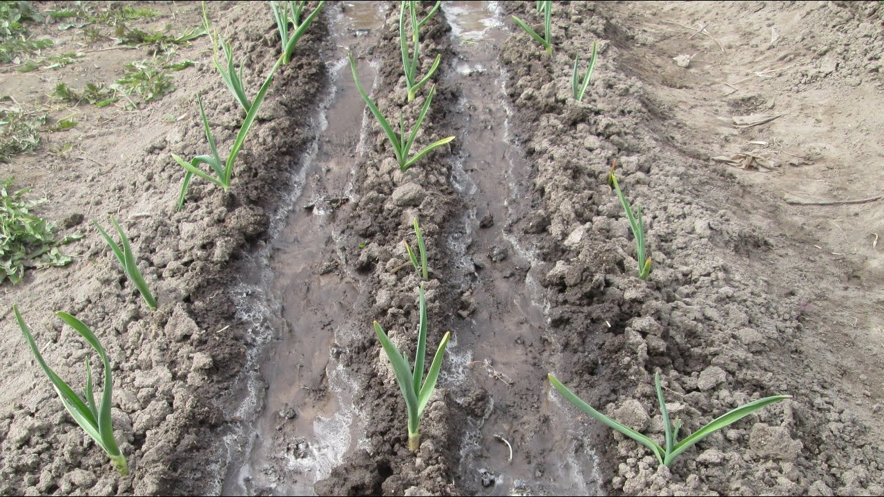 Для лучшей усвояемости вносимых удобрений рекомендуется между рядами выполнить небольшую канавку, в которую и заливается питательный настой чеснока. В последующем земля пропитается таким составом, который в последующем будет медленно впитываться созревающим на грядке чесноком.