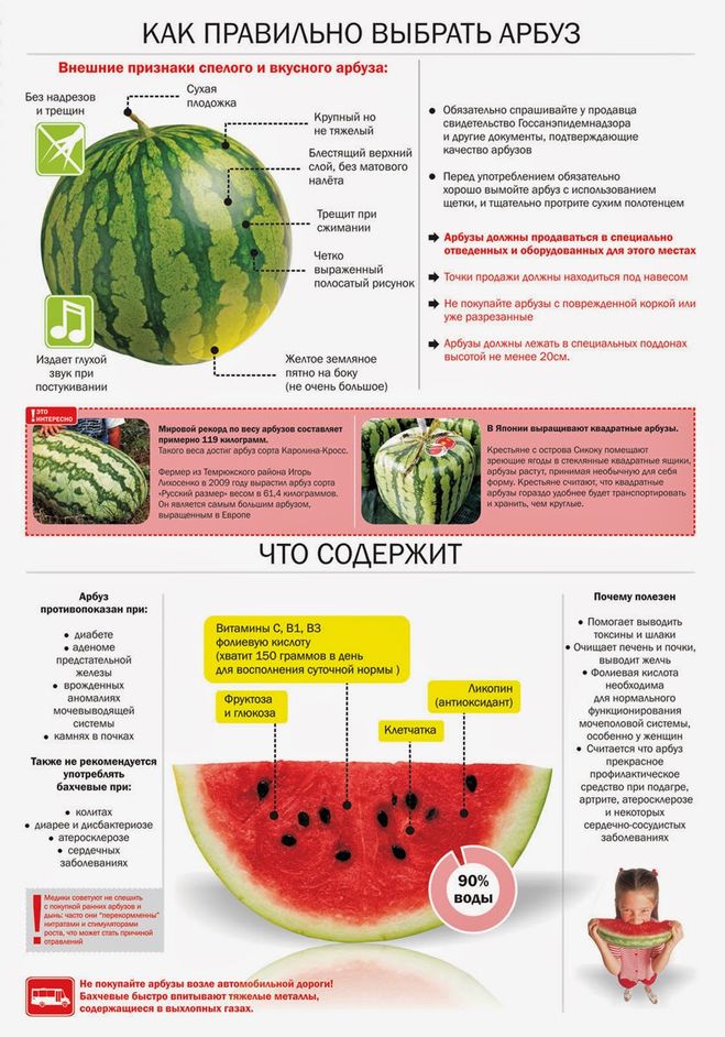 Первое, на что нужно обратить внимание, – трещины, даже если они очень маленькие. Продавец может предложить тебе такой арбуз подешевле. Но ни в коем случае не соглашайся. В арбуз с трещиной на кожуре могли попасть опасные бактерии и паразиты. Например, кишечная палочка или лямблии. И если ты съешь такой арбуз, то рискуешь заполучить пищевое отравление или паразитарную инфекцию. Помни также, что нельзя при покупке надрезать арбуз, чтобы убедиться, что он спелый. Треугольник на кожуре – это открытая дверь для микробов. Они тоже любят сладкое и в жару очень быстро размножаются. Пока ты донесешь арбуз домой, внутри будет полно микробов.