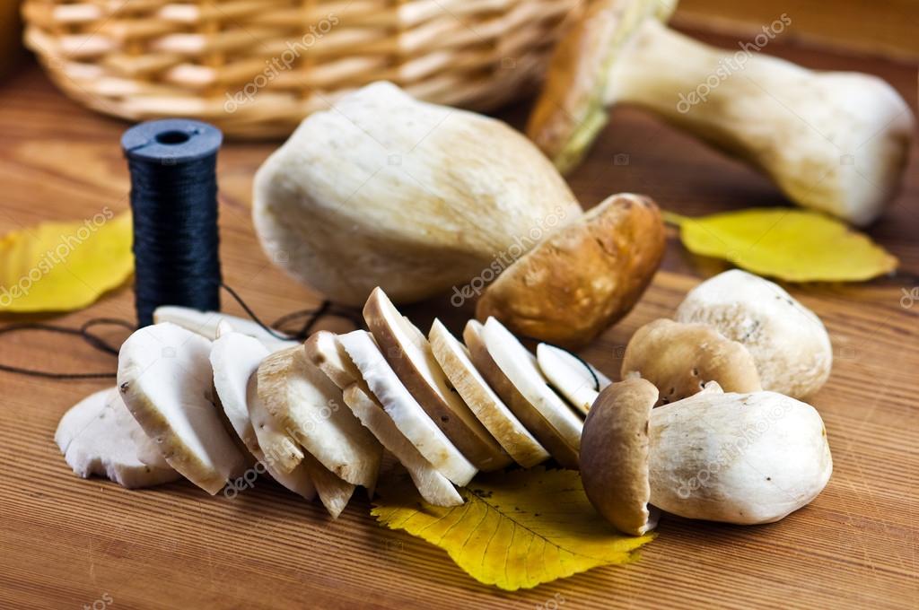Некоторые хозяйки предпочитают сушить грибы по старинке, на нитке. Для этого крупные экземпляры нарезают равномерными кусочками, мелкие берут целиком и нанизывают на крепкую, вощёную нить.