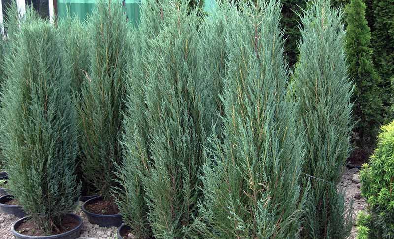 Пирамидальное дерево родом из Северной Америки в высоту может достигать до 10 м. Благодаря своей устойчивости к неблагоприятным факторам, скальные можжевельники очень востребованы в районах с жарким климатом. С их помощью создают высокие живые изгороди и различные хвойные композиции.